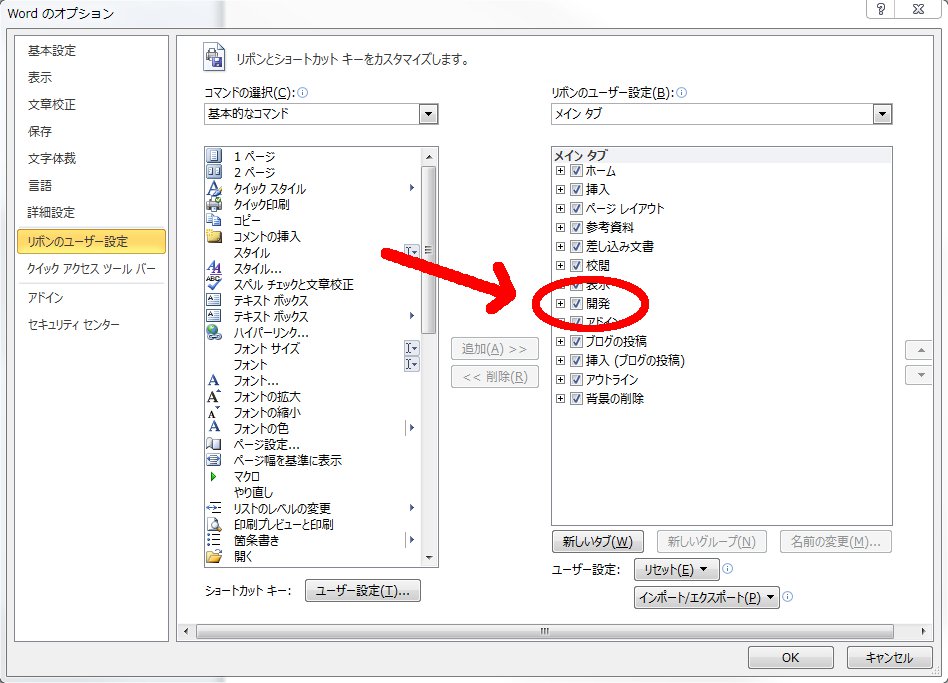 まずは、マクロが使えるように「ファイル」メニューの「オプション」で「開発」というリボンを表示させる。