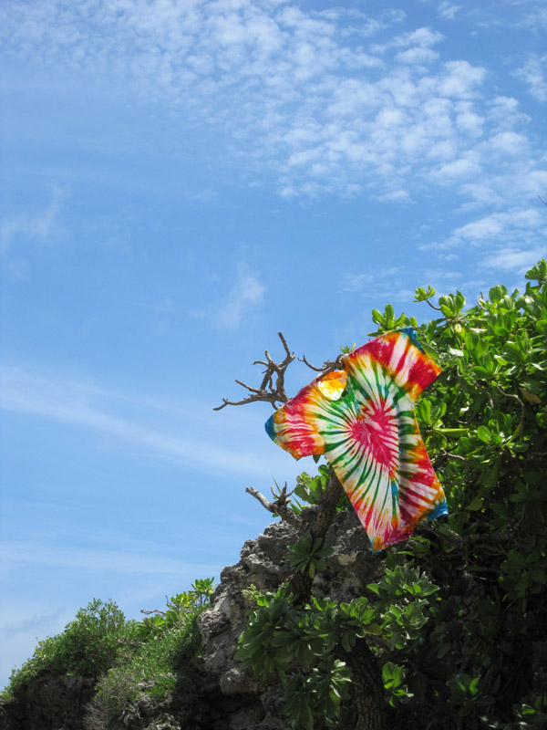 普段着るには派手すぎるシャツを着たりして、写真は枯れ枝をハンガーがわりにしてそのシャツを木に干したところ。